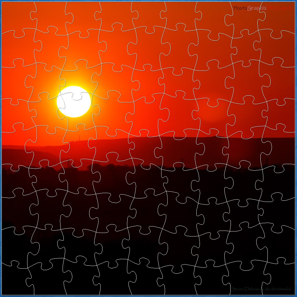 POWER TO THE PEOPLE! Look carefully, very carefully, and you'll see them - the pylons - carrying Power to the People! And then there's Our Sun. You simply cannot miss it. It’s the Main Feature. Fuelling our planet; pouring torrents of energy towards us; making us warm. And that's just what this picture is, a power house, all warm, and gloriously glowing. And just in case you’re curious about where this picture was taken, it was in The County of Bishops of course, and that would be County Durham, in the UK, where sunsets like these (and if you look carefully - the pylons too) can be seen all the year round. It all makes for a colourful, challenging jigsaw.